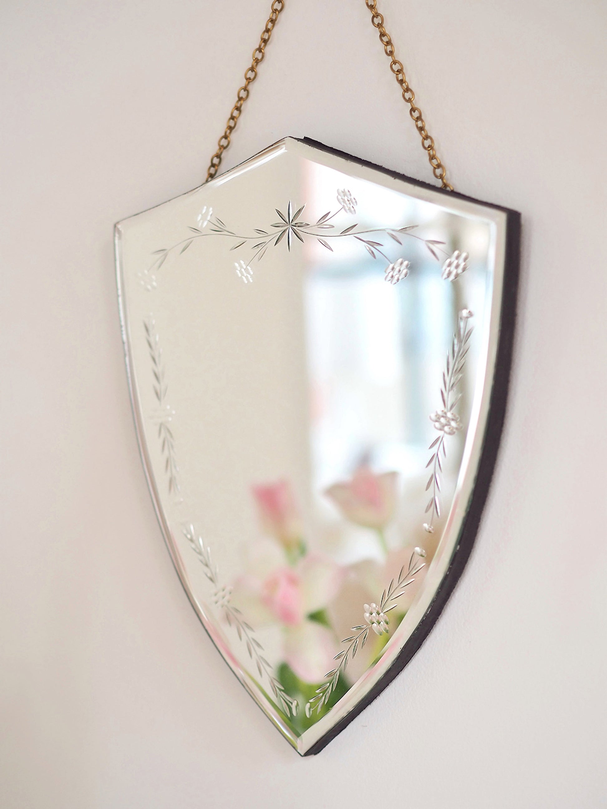 Set a top a wood base, the Mirror is around its perimeter with an ever green. The small mirror has an antique brass chain for hanging. Hang with other small- and medium-sized mirrors for wall display.